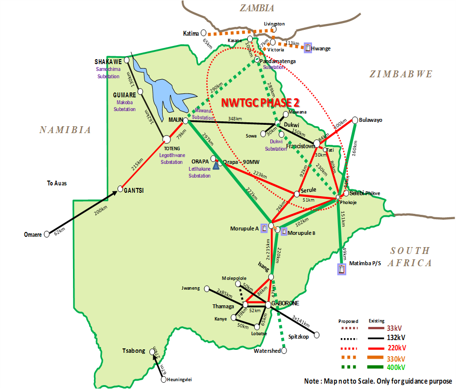 Botswana’s national electricity grid comprises of 1,246 kilometers of 400kV transmission lines, 2,200 kilometers of 220kV lines and 2,162 kilometers of 132kV lines. It further includes a total of 54 substations that facilitate bulk electricity supply to various customer categories. Distribution is provided at voltages of 33kV and 11kV, with sub-transmission operating at 66kV.